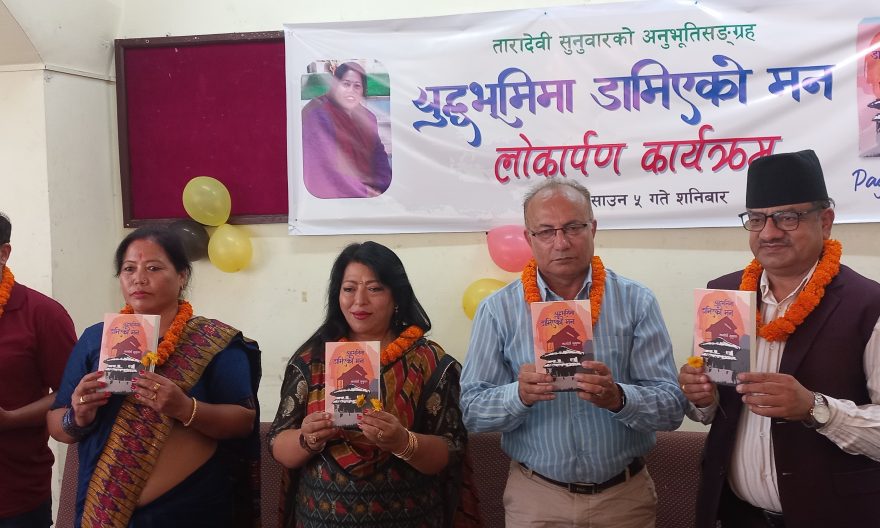 काठमाडौँ । लेखक तारादेवी सुनुवारको अनुभूति–निबन्ध सङ्ग्रह ‘युद्धभूमिमा डामिएको मन’ सार्वजनिक भएको छ । नियात्राकार प्रतीक ढकाल, साहित्यकार मोमिला, कवि डा. नवराज लम्साल र समालोचक डा. अशोक थापालगायतले आयोजित समारोहमा उक्त कृति सार्वजनिक गरेका हुन् ।